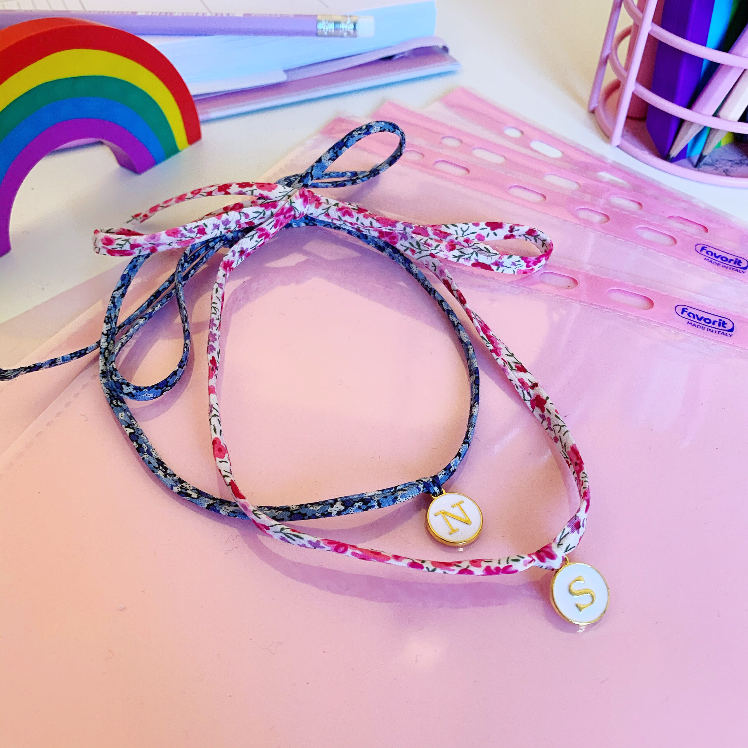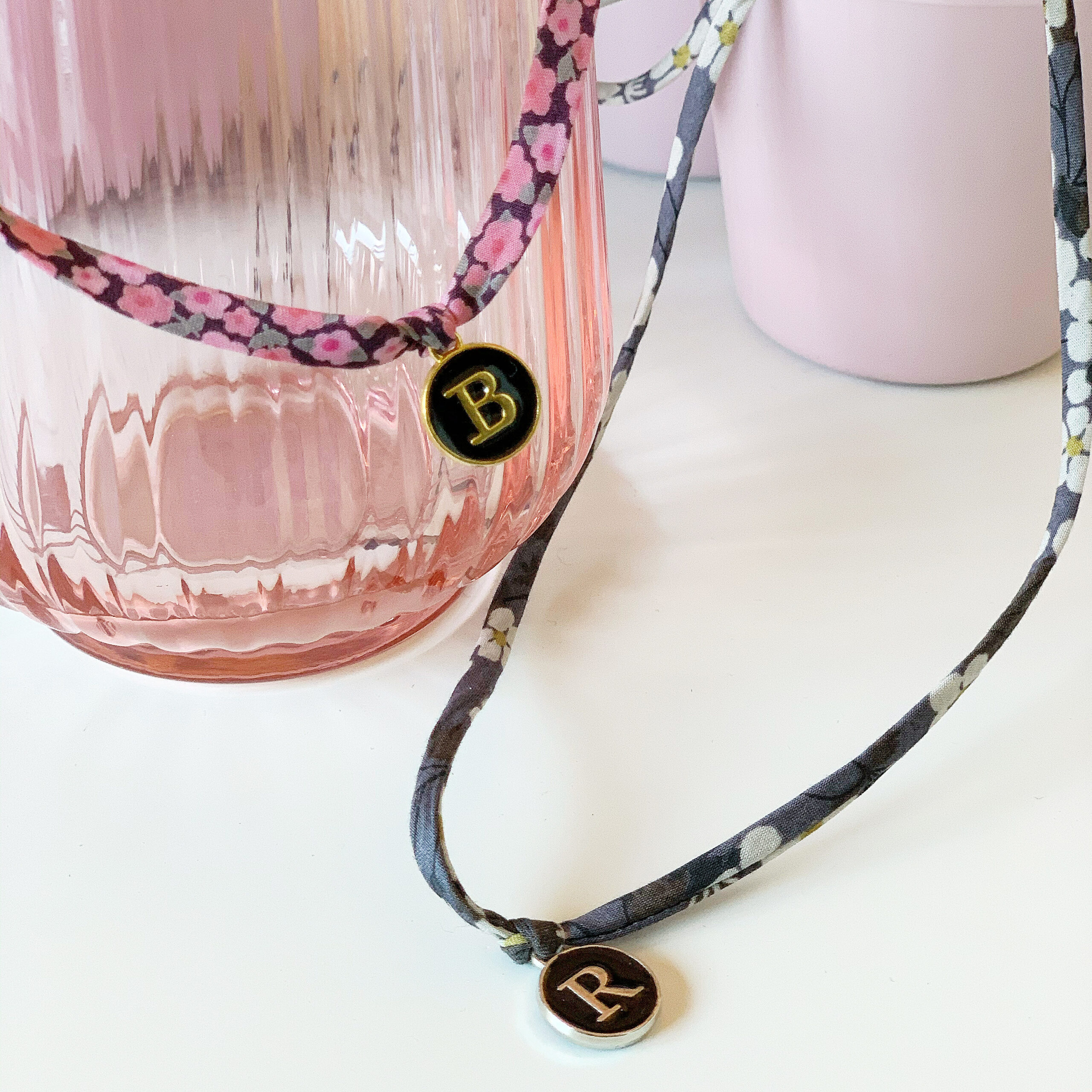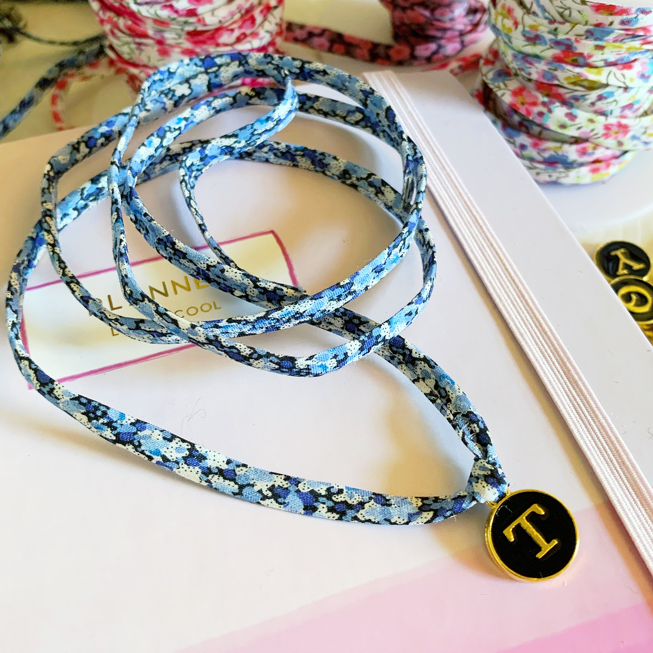 Letterina ciondolo smaltato con nastrino fantasia in cotone Liberty London.