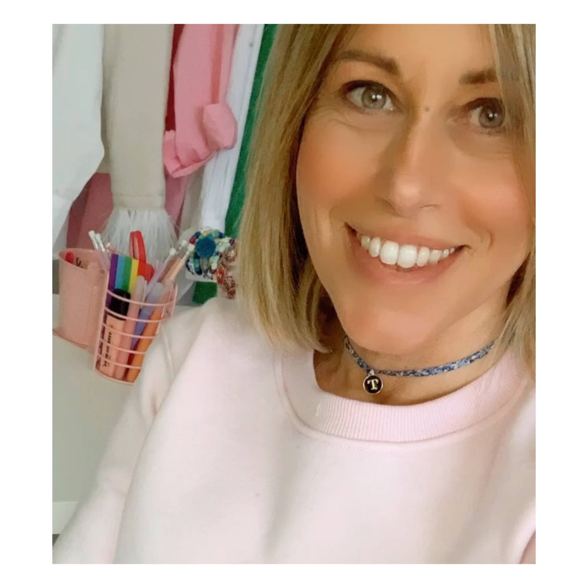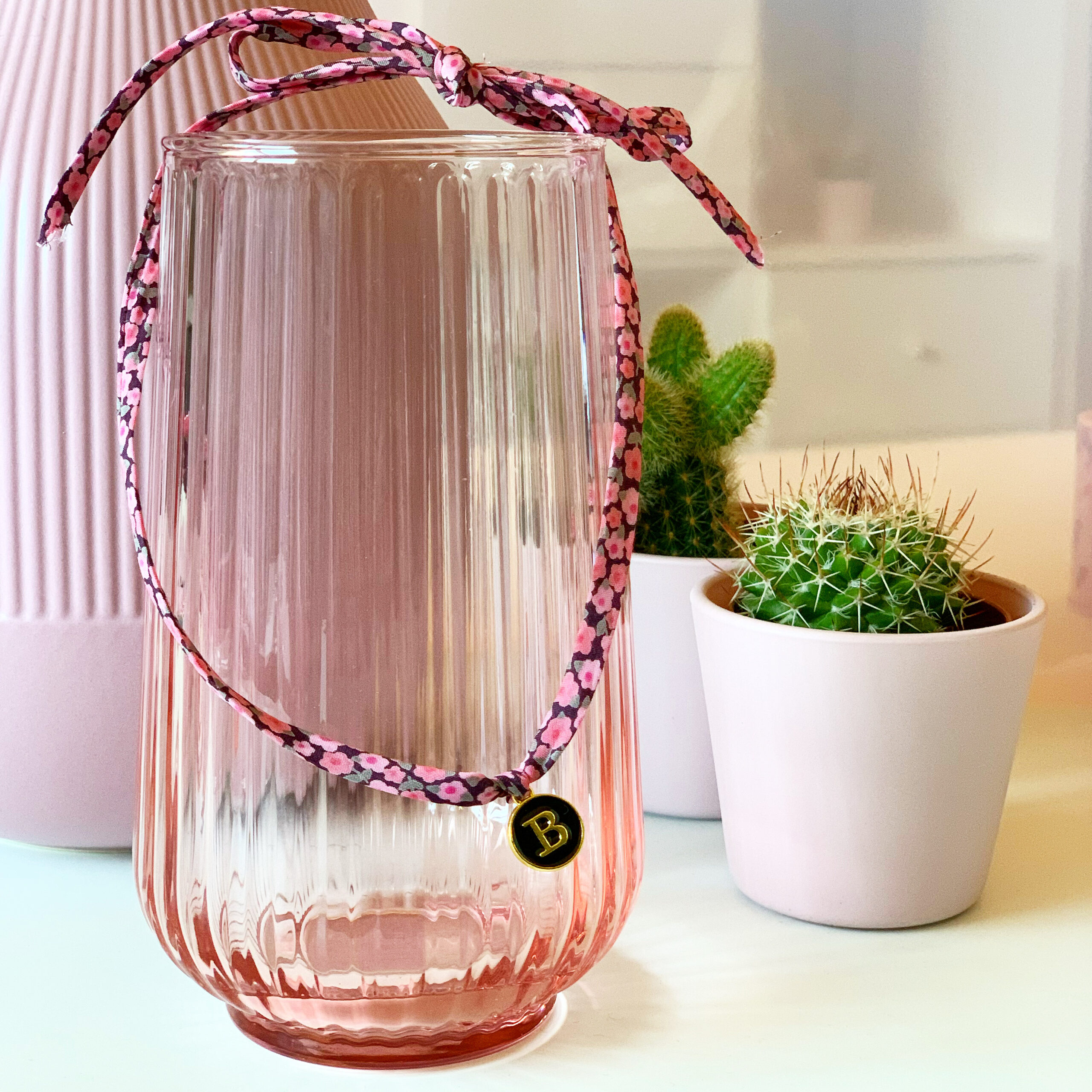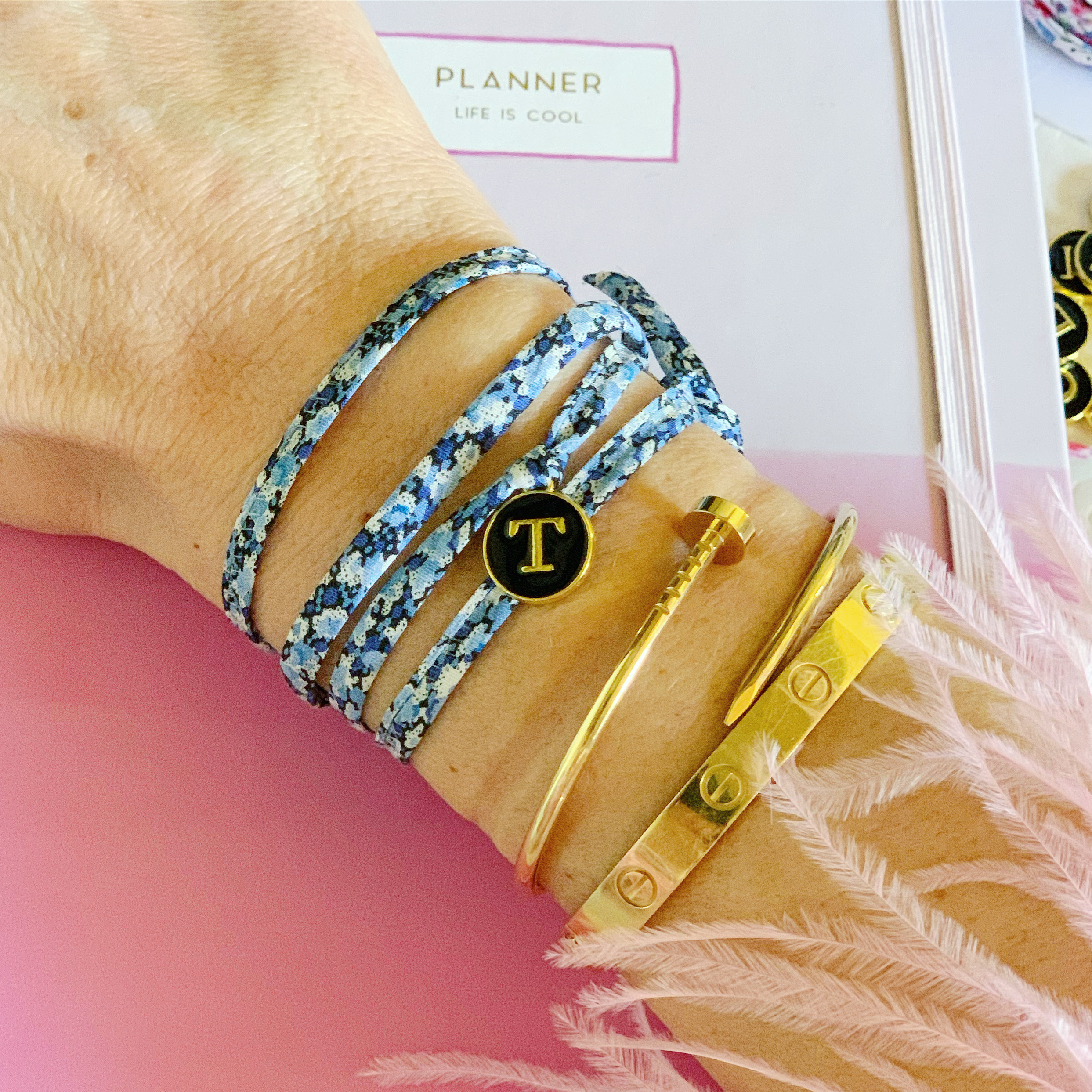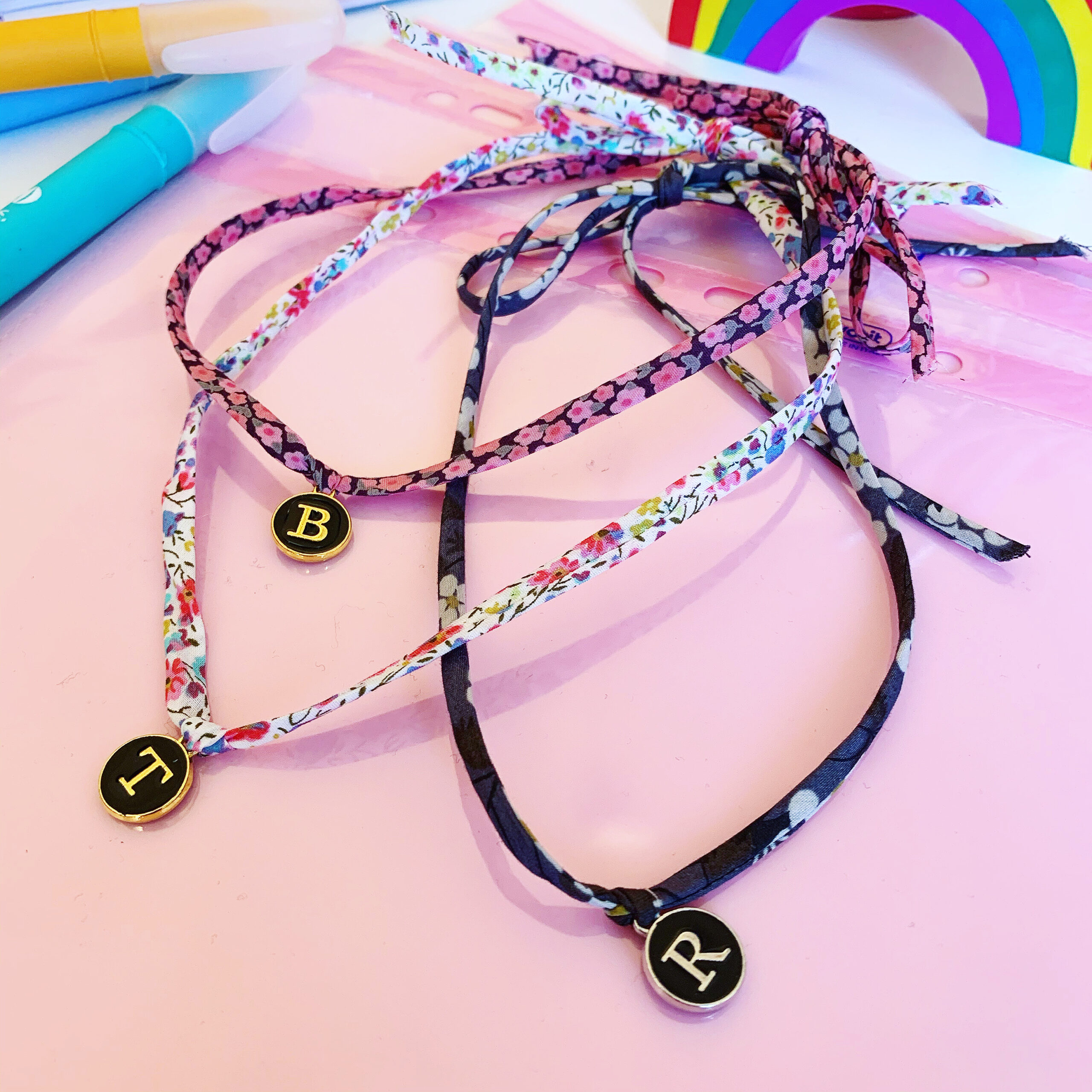 Letterina ciondolo smaltato con nastrino fantasia in cotone Liberty London.