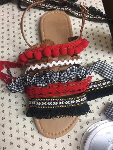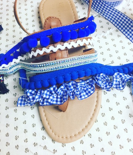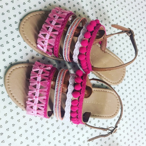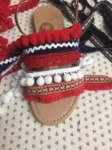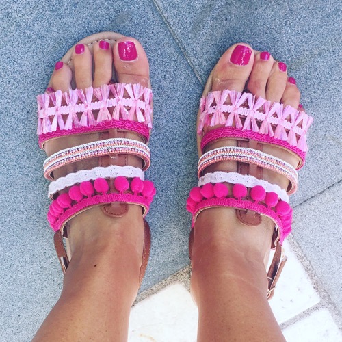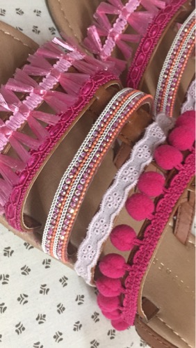 Sandali Tropeziennes costumizzati con applicazioni passameneria e pon pon. Modello multilistini con infradito.