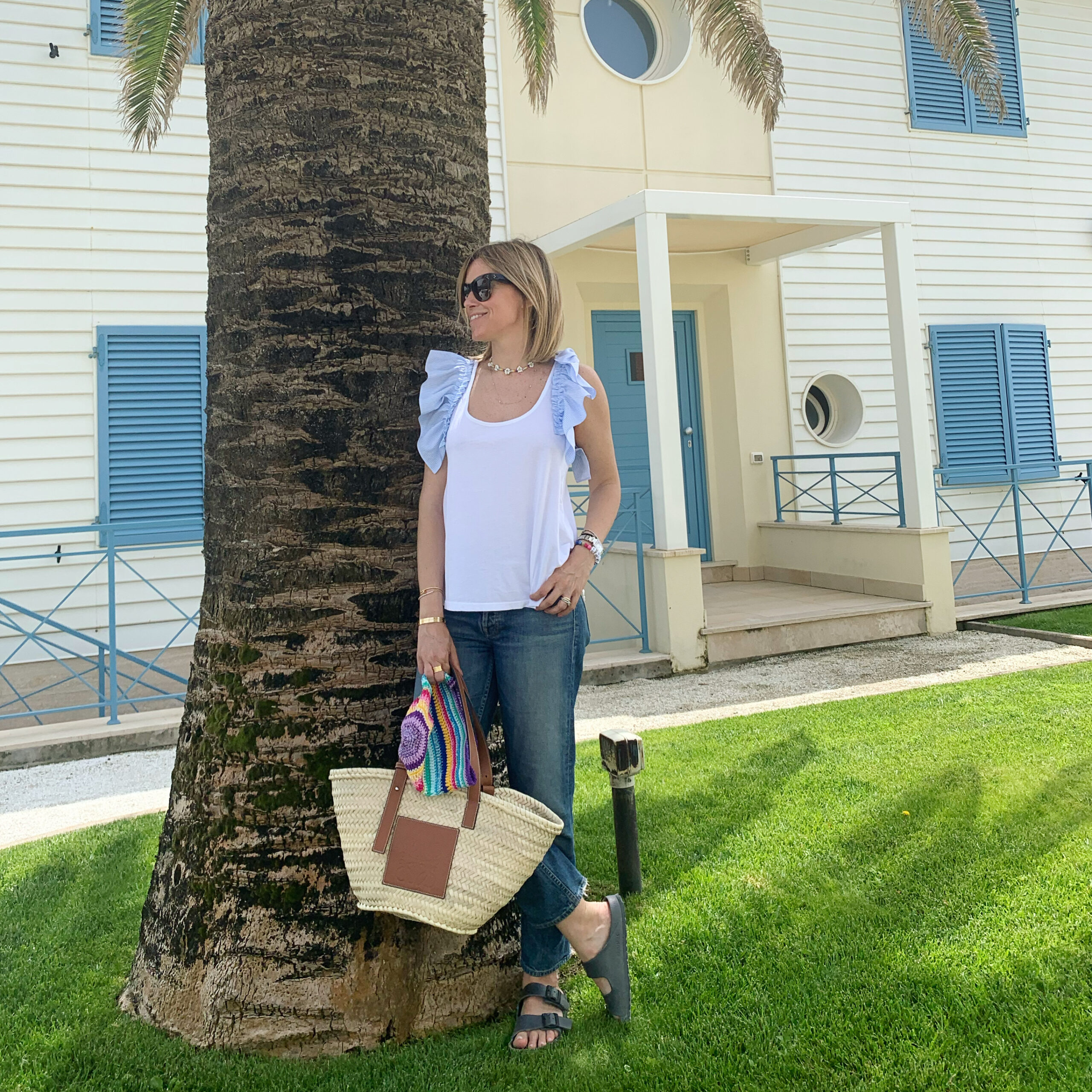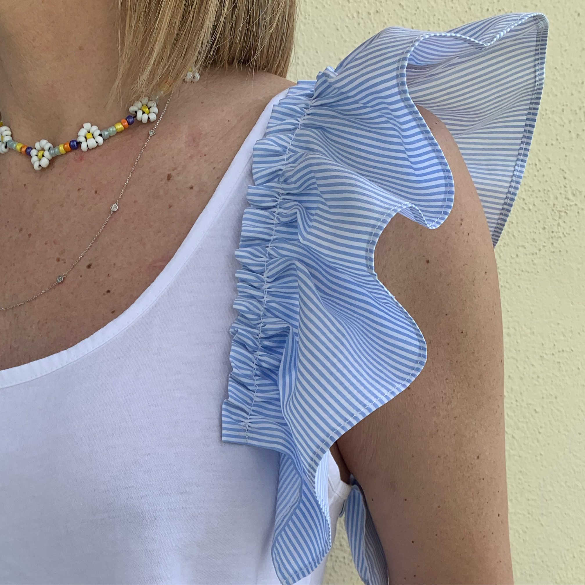 Applicazione sulle spalle Volant a righe bianche e celesti, 100% cotone.